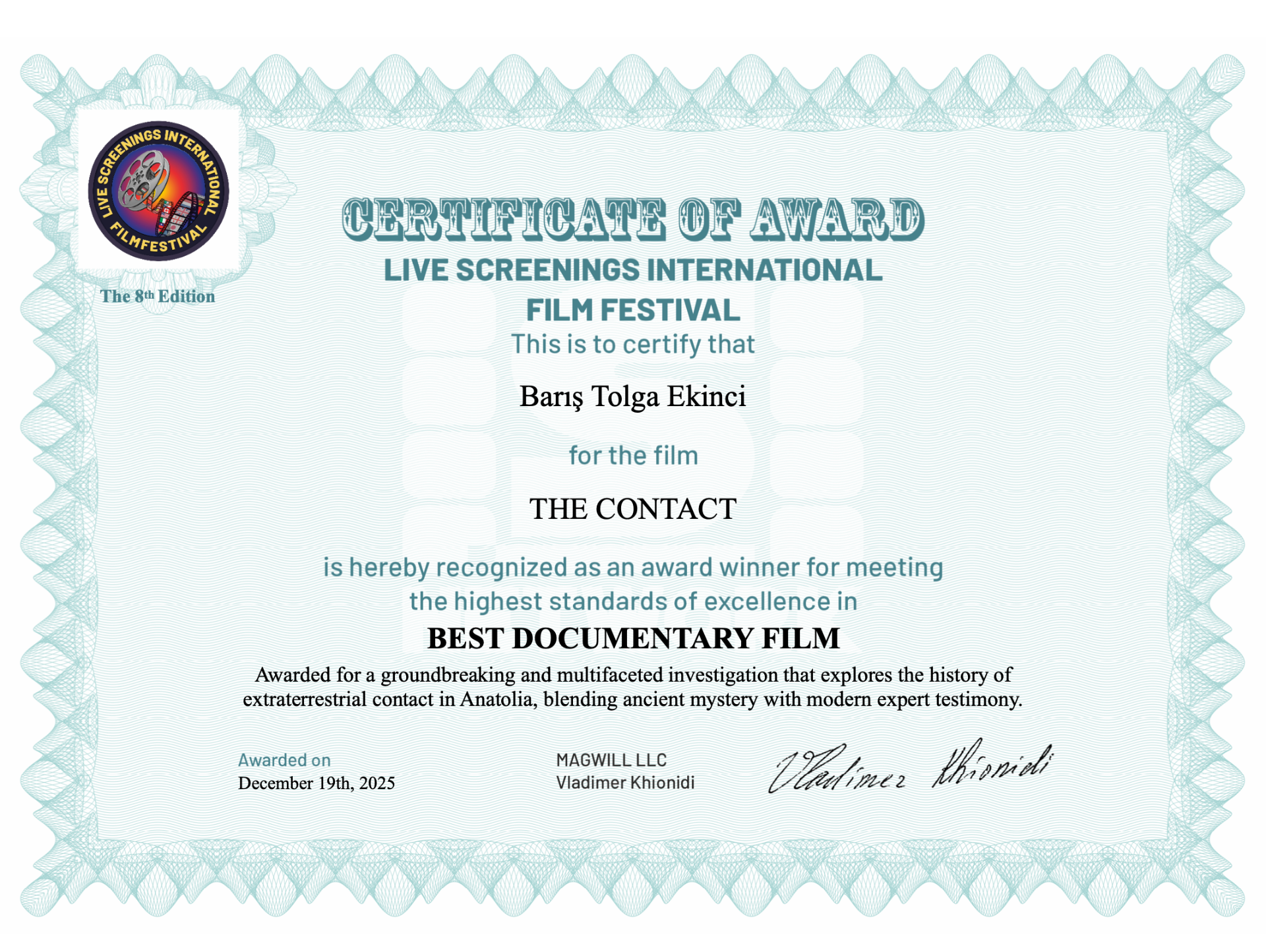 2025'in son günlerinde yine güzel bir haber geldi. Gürcistan'da bu yıl sekizincisi düzenlenen "Live Scrennings International Film Festival"nde Temas belgeseli En İyi Belgesel Ödülüne Layık görüldü. Festivalde yoğun ilgi gören Temas'a birçok dijital platformda teklifler geldi.